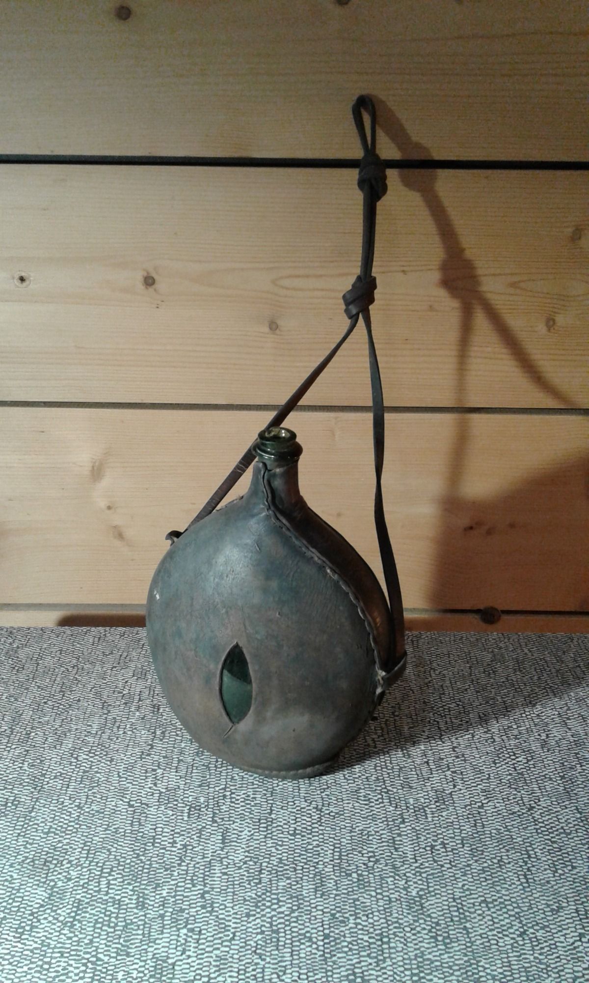 Bonbonne à panse aplatie en verre soufflé, de teinte vert foncé. Epoque fin XIX ième. Hauteur: 42 cm. Vendue